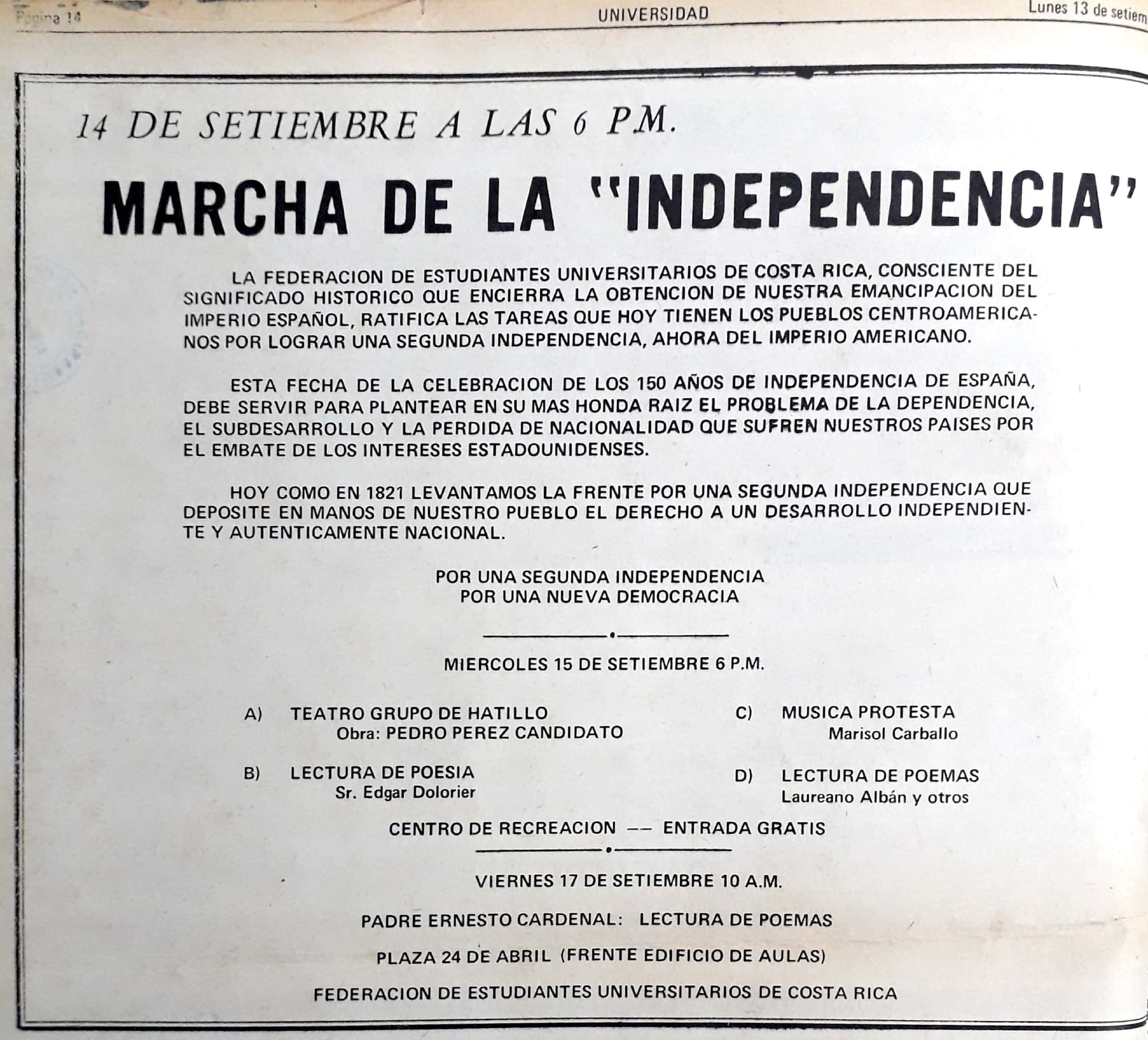 Invitación a la "Marcha de la Independencia" a celebrarse el 14 de setiembre (a las 6 p.m.).