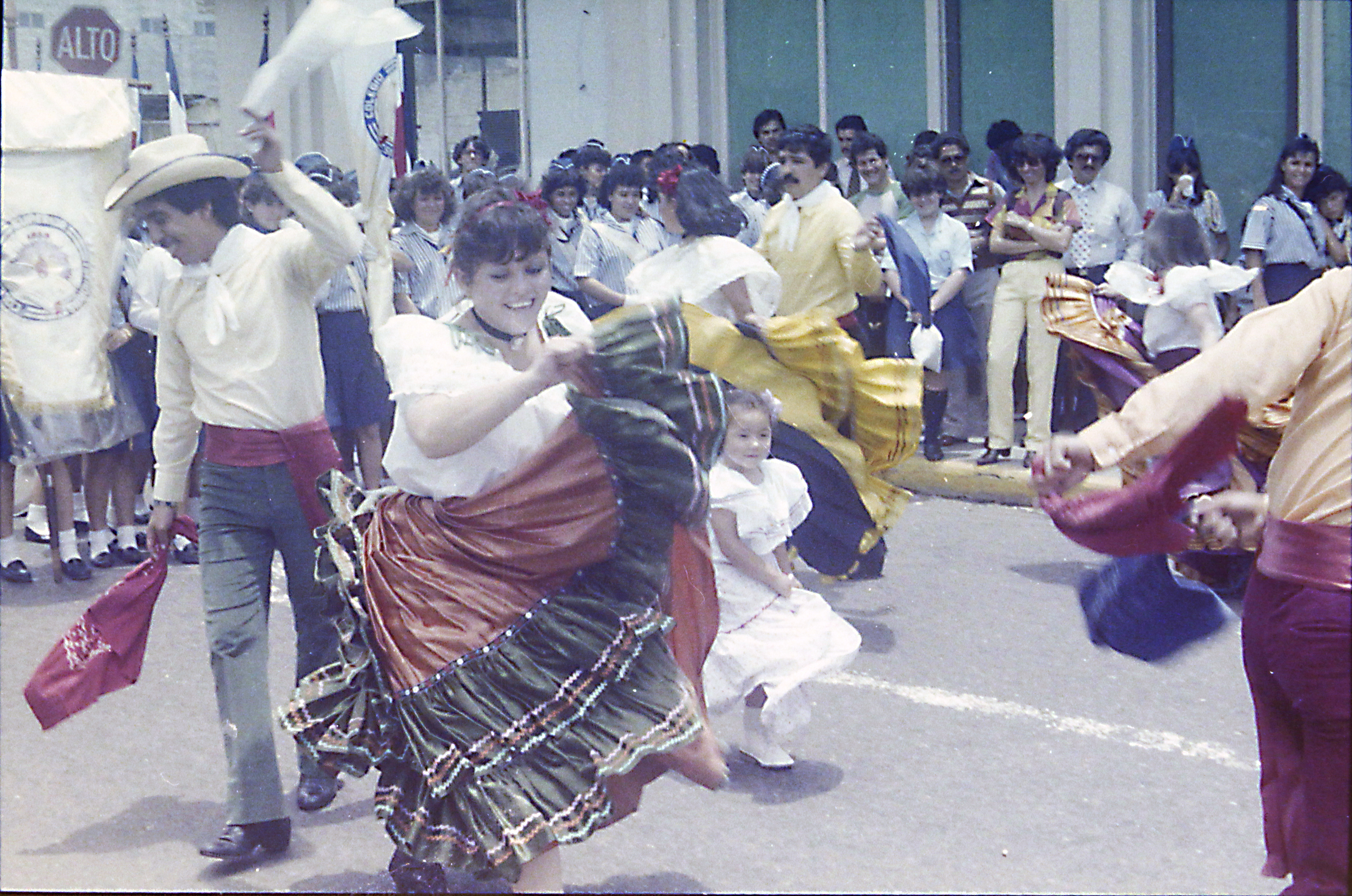 Foto cuatro personas en baile folklórico (vestidas de traje típico), incluida una niña frente a las puertas de ingreso del Archivo Nacional.