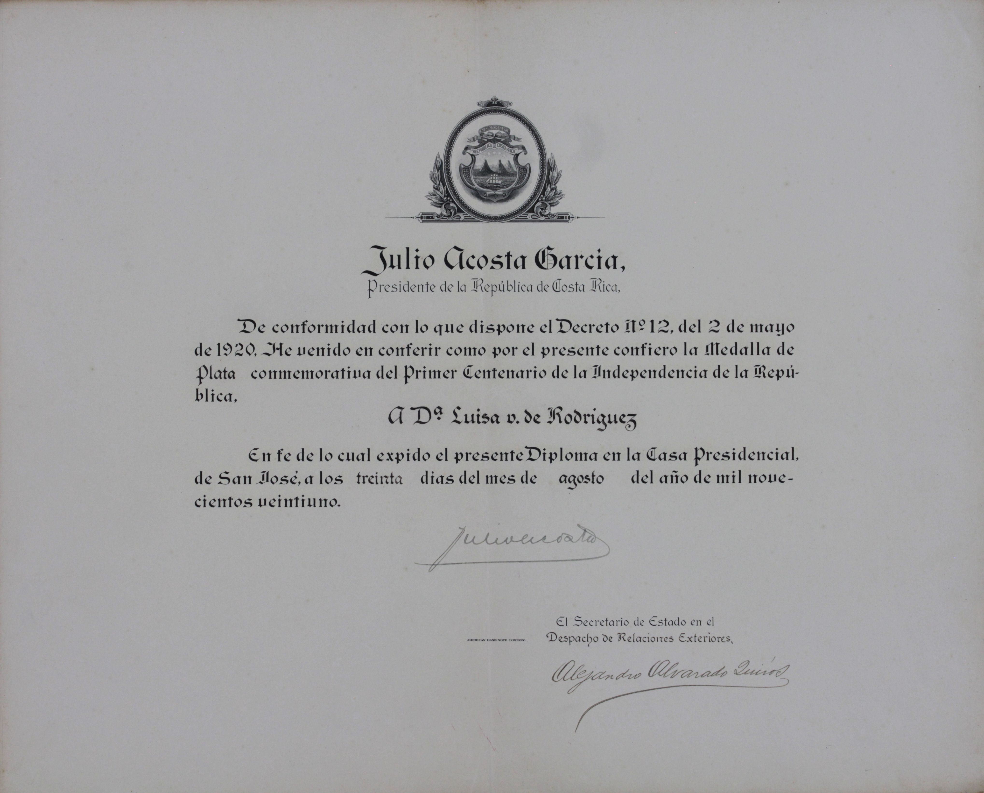 | dc.description.abstract | En el gobierno de Julio Acosta García, se realiza el decreto n° 12, el 12 de mayo de 1920. Se confiere la Medalla de Plata conmemorativa del Primer Centenario de la Independencia de la República a Luisa de Rodríguez . Firmado por Alejandro Alvarado Quirós | es_ES |
