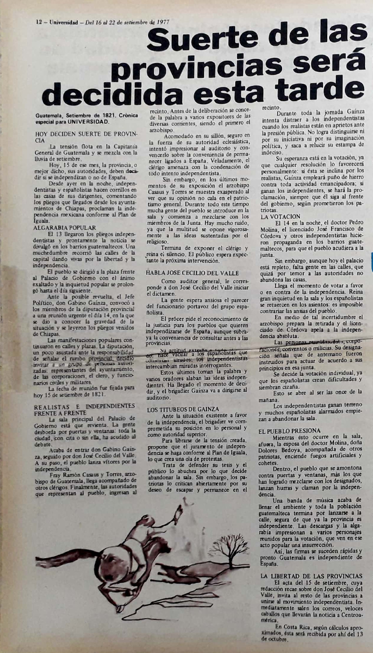 Semanario Universidad - Publicaciones periódicas, Política, 1821, Valle, José Cecilio del (1780-1834), Gainza y Fernández Medrano, Gabino (1753-1829), Gobierno, Guatemala, 15 de setiembre