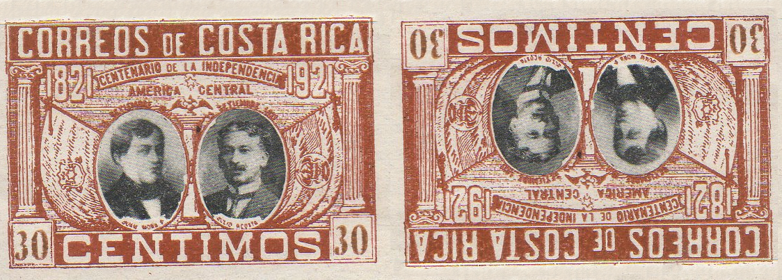 Sello postal para el Centenario de la Independencia de Costa Rica, con un valor de 30 céntimos en color anaranjado, con los rostros de Julio Acosta y Juan Mora Fernández.